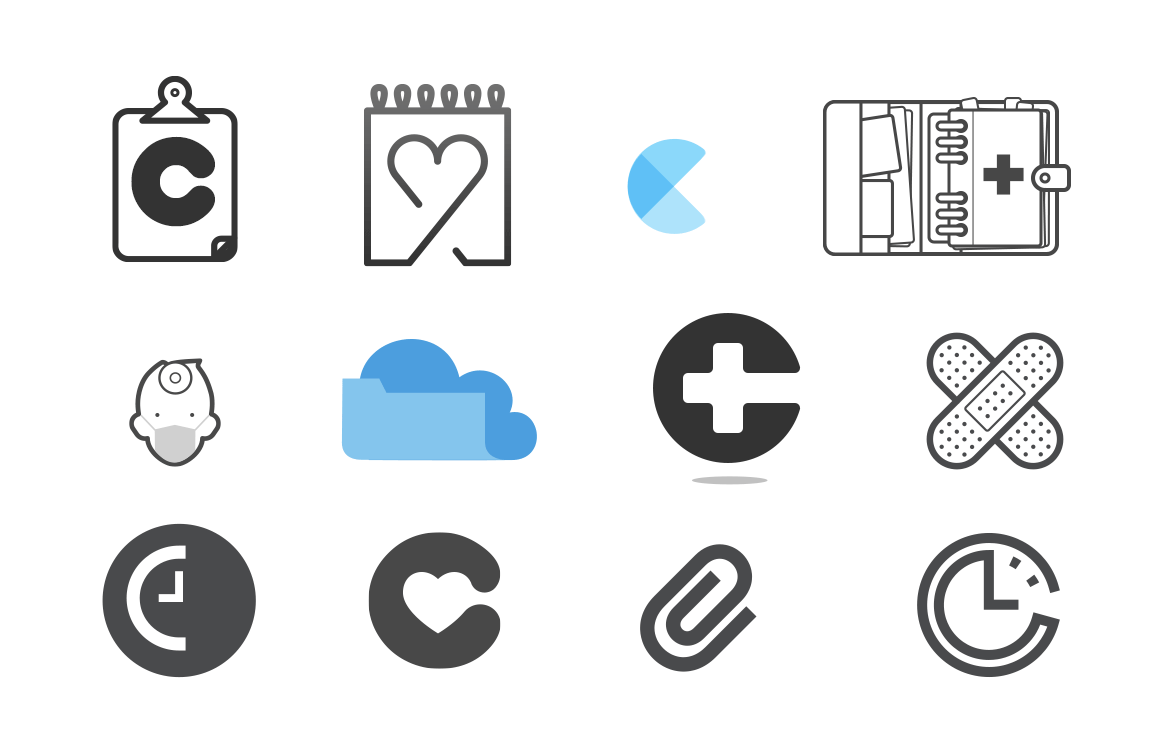 Referring to these lists, I then started brainstorming potential visual elements that might work as in a logo. I threw myself into Photoshop and Illustrator and started drawing indiscriminately, adding to the work I had done back in June2. But nothing jumped out. Joel didn't want to use a cross or a heart. Tools of the trade and practitioner related imagery is difficult; if we used a stethoscope or something similar, then we would be alienating most of our customers since the clinics are so varied. Calendars and clocks and clouds would all work well enough, but immediately strike me as being overused on the web.