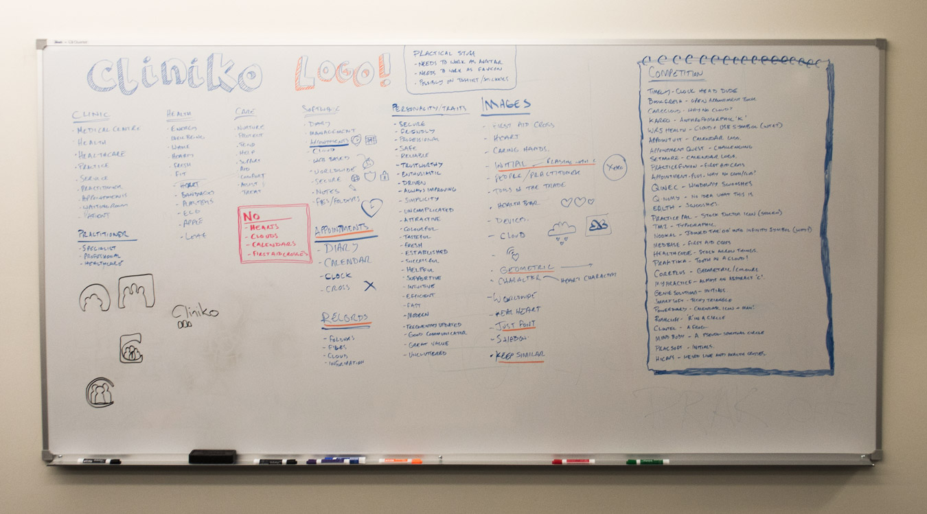 Having been frustrated in my first attempt, I wanted to really have a go at a logical and thorough approach this time around. We had just put up a massive white board at Red Guava HQ1, so I started listing out a few key words and themes that relate to Cliniko. Under each of these I listed as many associated words as I could think of. I also, rather pretentiously, listed a bunch of personality traits that Cliniko might have if it were a person, in the naive hope that by just doing more stuff I would end up in a better position than I was at the time.
